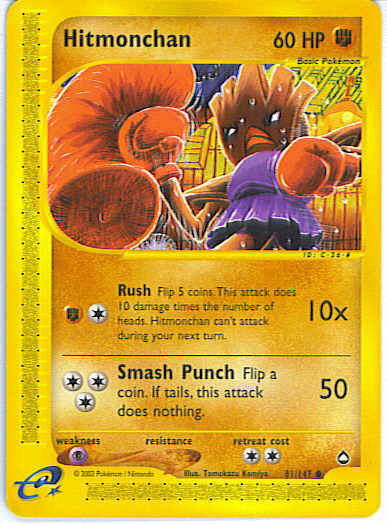 Type | Fighting | Pokemon serie | Aquapolis | Stadie | Basic | HP | 60 | Sjældenhed | Common | Tilbagetrækning | 2 | Svaghed | P | Kortnummer | 81 | Evne | [CF] Rush (10x) Flip 5 coins. This attack does 10 damage times the number of heads. Hitmonchan can't attack during your next turn. [CCC] Smash Punch (50) Flip a coin. If tails, this attack does nothing.