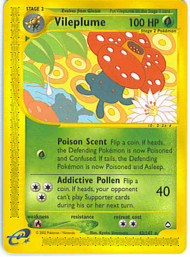 Type | Grass | Pokemon serie | Aquapolis | Stadie | Stage 2 | HP | 100 | Sjældenhed | Rare | Tilbagetrækning | 2 | Svaghed | P | Kortnummer | 43 | Evne | [G] Poison Scent - Flip a coin. If heads, the Defending Pokemon is now Poisoned and Confused. If tails, the Defending Pokemon is now Poisoned and Asleep. [CCC] Addictive Pollen (40) Flip a coin. If heads, your opponent can't play any Supporter cards during his or her next turn.