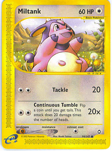 Type | Colorless | Pokemon serie | Aquapolis | Stadie | Basic | HP | 60 | Sjældenhed | Common | Tilbagetrækning | 1 | Svaghed | F | Kortnummer | 94 | Evne | [CC] Tackle (20) [CC] Continuous Tumble (20x) Flip a coin until you get tails. This attack does 20 damage times the number of heads.