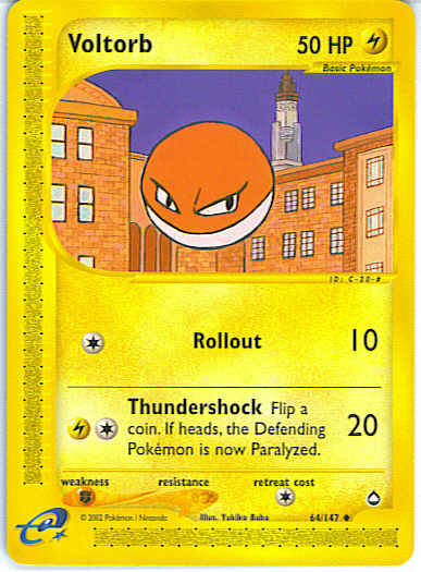 Type | Lightning | Pokemon serie | Aquapolis | Stadie | Basic | HP | 50 | Sjældenhed | Uncommon | Tilbagetrækning | 1 | Svaghed | F | Kortnummer | 64 | Evne | [C] Rollout (10) [CL] Thundershock (20) Flip a coin. If heads, the Defending Pokemon is now Paralyzed.
