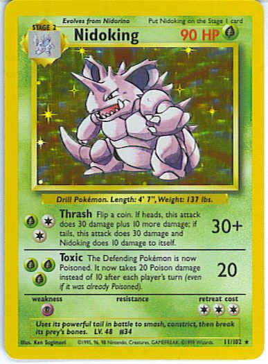 Evne [CCG] Thrash (30+) Flip a coin. If heads, this attack does 30 damage plus 10 more damage; If tails, this attack does 30 damage plus Nidoking does 10 damage to self.
