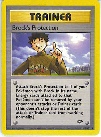 Evne Attach Brock's Protection to 1 of your Pokemon with Brock in its name. Energy cards attached to that Pokemon can't be removed by your opponent's attacks or Trainer cards. (This doesn't stop the rest of the attack or Trainer card from working normally.)
