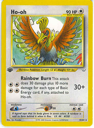 Evne [CCCC] Rainbow Burn (30+) This attack does 30 damage plus 10 more for each type of Basic Energy card if any, attached to Ho-oh.