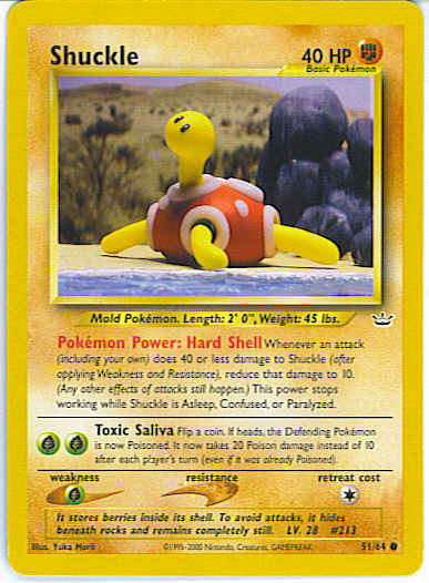 Type | Fighting | Pokemon serie | Neo Revelation | Stadie | Basic | HP | 40 | Sjældenhed | Common | Tilbagetrækning | 1 | Svaghed | G | Kortnummer | 51 | Evne | of attacks still happen.) This power stops working while Shuckle is Asleep, Confused, or Paralyzed.