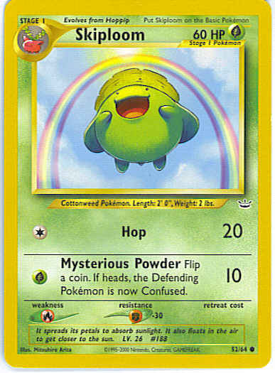 Type | Grass | Pokemon serie | Neo Revelation | Stadie | Stage 1 | HP | 60 | Sjældenhed | Common | Tilbagetrækning | 2 | Modstand | F | Svaghed | R | Kortnummer | 52 | Evne |