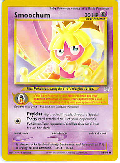 Type | Psychic | Pokemon serie | Neo Revelation | Stadie | Baby | HP | 30 | Sjældenhed | Common | Kortnummer | 54 | Evne |