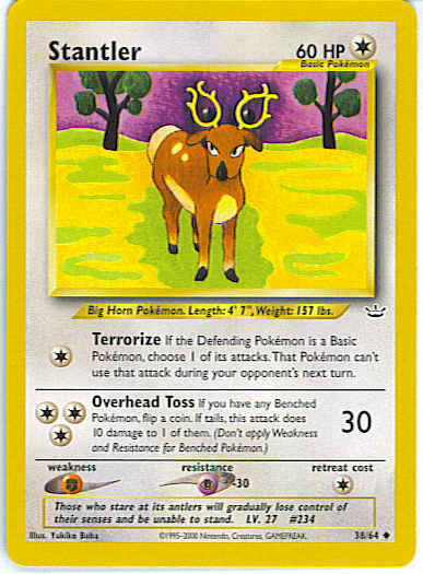 Type | Colorless | Pokemon serie | Neo Revelation | Stadie | Basic | HP | 60 | Sjældenhed | Uncommon | Tilbagetrækning | 1 | Modstand | P | Svaghed | F | Kortnummer | 38 | Evne |