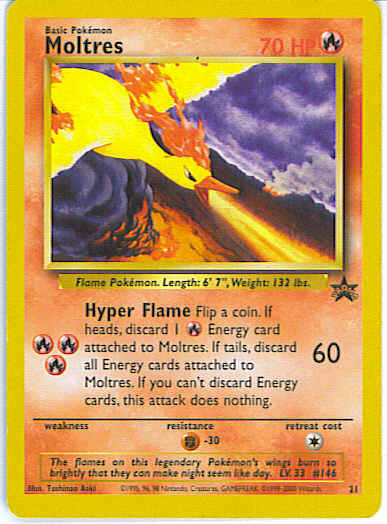 Evne [RRR] Hyper Flame (60) Flip a coin. If heads, discard 1 R Energy card attached to Moltres. If tails, discard all Energy cards attached to Moltres. If you can't discard Energy cards, this attack does nothing.