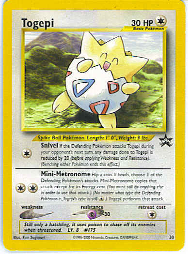 [C] Snivel - If the Defending Pokemon attacks Togepi during your opponent's next turn, any damage done to Togepi is reduced by 20 (before applying Weakness and Resistance). (Benching either Pokemon ends this effect.)