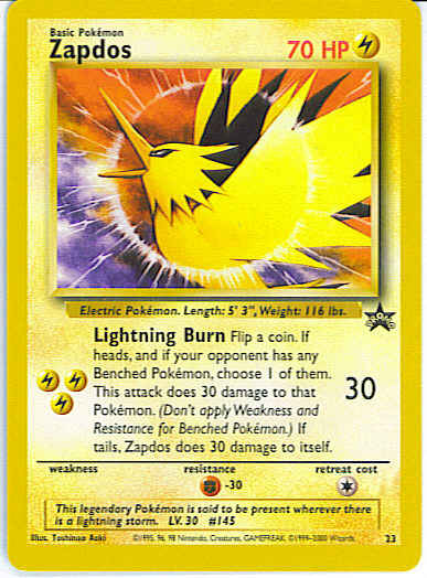 Type | Lightning | Pokemon serie | WoTC Promo | Stadie | Basic | HP | 70 | Sjældenhed | Promo | Tilbagetrækning | 1 | Modstand | F | Kortnummer | 23 | Evne |
