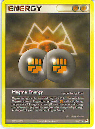 Evne2Magma Energy can be attached only to a Pokemon with Team Magma in its name. Magma Energy provides F and D Energy but provides 2 Energy at a time. (Doesn't count as a basic Energy card when not in play and has no effect other than providing Energy.) At the end of your turn, discard Magma Energy.