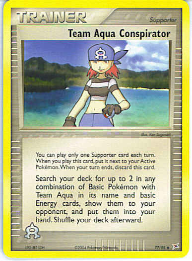 Type | Trainer | Pokemon serie | Team Aqua-Team Magma | Stadie | Trainer (Supporter) | Sjældenhed | Uncommon | Kortnummer | 77 | Evne | Search your deck for up to 2 in any combination of Basic Pokemon with Team Aqua in its name and basic Energy cards, show them to your opponent, and put them into your hand. Shuffle your deck afterward.