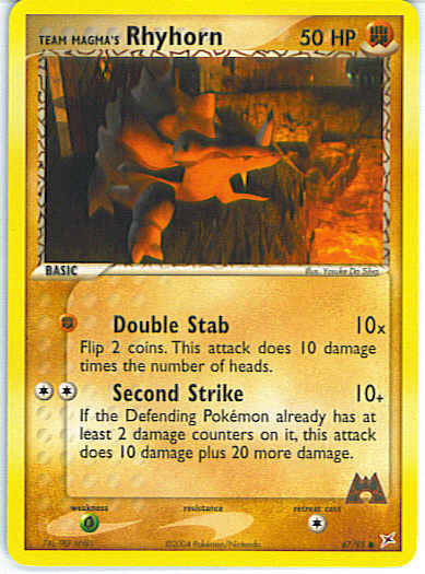 Type | Fighting | Pokemon serie | Team Aqua-Team Magma | Stadie | Basic | HP | 50 | Sjældenhed | Common | Tilbagetrækning | 1 | Svaghed | G | Kortnummer | 67 | Evne | [F] Double Stab (10x) Flip 2 coins. This attack does 10 damage times the number of heads. [CC] Second Strike (10+) If the Defending Pokemon already has at least 2 damage counters on it, this attack does 10 damage plus 20 more damage.