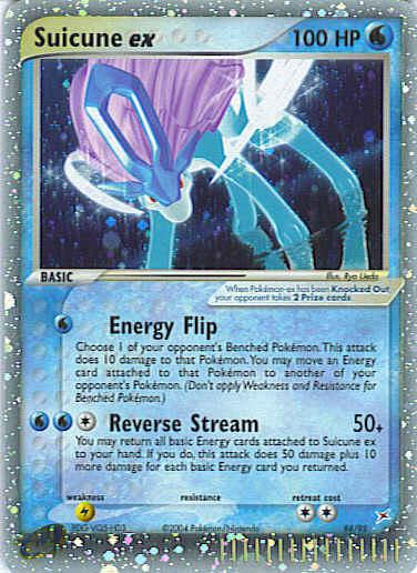 Type | Water | Pokemon serie | Team Aqua-Team Magma | Stadie | Basic | HP | 100 | Sjældenhed | Ultra-Rare | Tilbagetrækning | 2 | Svaghed | L | Kortnummer | 94 | Evne | [W] Energy Flip - Choose 1 of your opponent's Benched Pokemon. This attack does 10 damage to that Pokemon. You may move any Energy card attached to that Pokemon to another of your opponent's Pokemon. (Don't apply Weakness and Resistance for Benched Pokemon.) [CWW] Reverse Stream (50+) You may return all basic Energy cards attached to Suicune ex to your hand. If you do, this attack does 50 damage plus 10 more damage for each basic Energy card you returned.