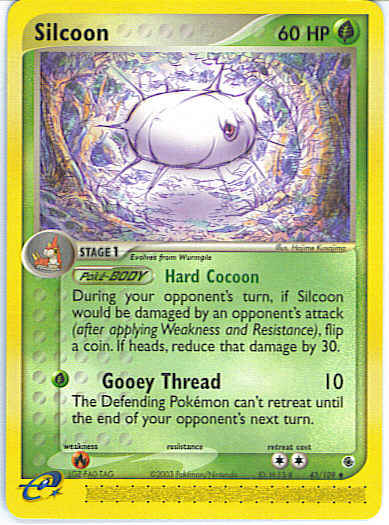 Type | Grass | Pokemon serie | Ruby Sapphire | Stadie | Stage 1 | HP | 60 | Sjældenhed | Uncommon | Tilbagetrækning | 2 | Svaghed | R | Kortnummer | 43 | Evne | [G] Gooey Thread (10) The Defending Pokemon can't retreat until the end of your opponent's next turn.