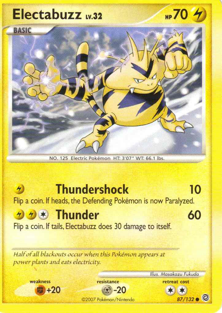 Type | Lightning | Pokemon serie | Secret Wonders | Stadie | Basic | HP | 70.0 | Sjældenhed | Common | Tilbagetrækning | 2.0 | Modstand | M-20 | Svaghed | F+20 | Kortnummer | 87 | Evne | [L] Thundershock (10) Flip a coin. If heads, the Defending Pokemon is now Paralyzed. [CLL] Thunder (60) Flip a coin. If tails, Electabuzz does 30 damage to itself.
