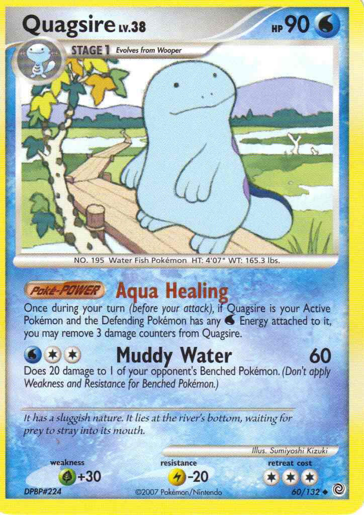 Type | Water | Pokemon serie | Secret Wonders | Stadie | Stage 1 | HP | 90.0 | Sjældenhed | Uncommon | Tilbagetrækning | 3.0 | Modstand | L-20 | Svaghed | G+30 | Kortnummer | 60 | Evne | [CCW] Muddy Water (60) Does 20 damage to 1 of your opponent's benched Pokemon. (Don't apply Weakness and Resistance for Benched Pokemon.)