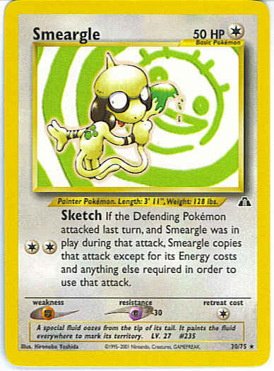 [CC] Sketch - If the Defending Pokemon attacked last turn, and Smeargle was in play during that attack, Smeargle copies that attack except for its Energy costs and anything else required in order to use that attack.