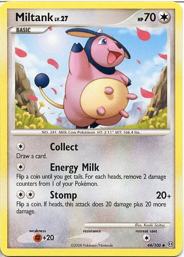 Type | Colorless | Pokemon serie | Stormfront | Stadie | Basic | HP | 70.0 | Sjældenhed | Uncommon | Tilbagetrækning | 1.0 | Svaghed | F+20 | Kortnummer | 44 | Evne | [C] Collect - Draw a card. [C] Energy Milk - Flip a coin until you get tails. For each heads, remove 2 damage counters from 1 of your Pokemon. [CC] Stomp (20+) Flip a coin. If heads, this attack does 20 damage plus 20 more damage.