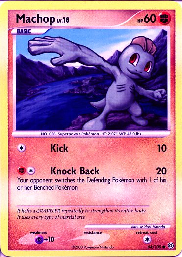 Type | Fighting | Pokemon serie | Stormfront | Stadie | Basic | HP | 60.0 | Sjældenhed | Common | Tilbagetrækning | 1.0 | Svaghed | P+10 | Kortnummer | 64 | Evne |