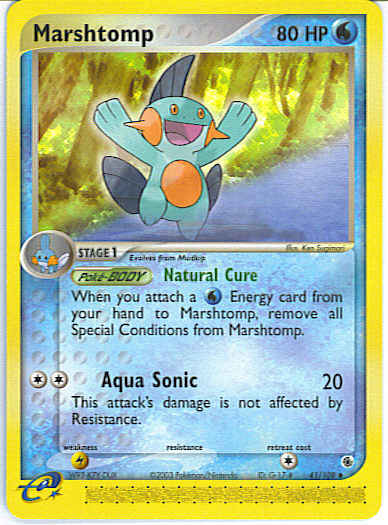 Type | Water | Pokemon serie | Ruby Sapphire | Stadie | Stage 1 | HP | 80 | Sjældenhed | Uncommon | Tilbagetrækning | 1 | Svaghed | L | Kortnummer | 41 | Evne | [CC] Aqua Sonic (20) This attack's damage is not affected by Resistance.
