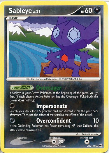 [D] Overconfident (10) If the Defending Pokemon has fewer remaining HP than Sableye, this attack's damage is 40.