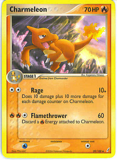 Type | Fire | Pokemon serie | Crystal Guardians | Stadie | Stage 1 | HP | 70 | Sjældenhed | Uncommon | Tilbagetrækning | 1 | Svaghed | W | Kortnummer | 29 | Evne | [CC] Rage (10+) Does 10 damage plus 10 more damage for each damage counter on Charmeleon. [CRR] Flamethrower (60) Discard a R Energy attached to Charmeleon. | Evne2 | [CC] Rage (10+) Does 10 damage plus 10 more damage for each damage counter on Charmeleon. [CRR] Flamethrower (60) Discard a R Energy attached to Charmeleon. | Kunstner | Kagemaru Himeno |