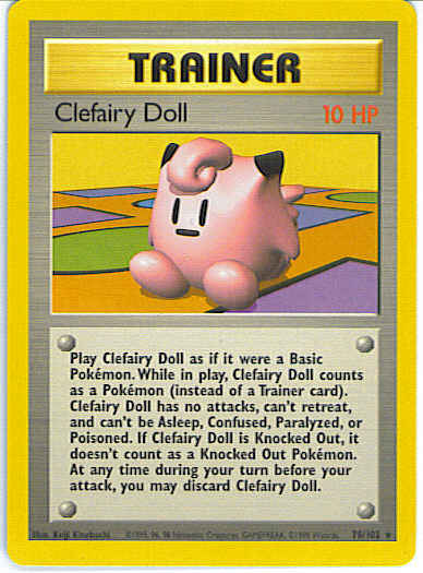 Evne Play Clefairy Doll as if it were a Basic Pokemon. While in play, Clefairy Doll counts as a Pokemon (instead of a Trainer card.) Clefairy Doll has no attacks, can't retreat, and can't be Asleep, Confused, Paralyzed, or Poisoned. If Clefairy Doll is K-O'd, it doesn't count as a K-O. At any time during your turn (before attack), you may discard Clefairy Doll.