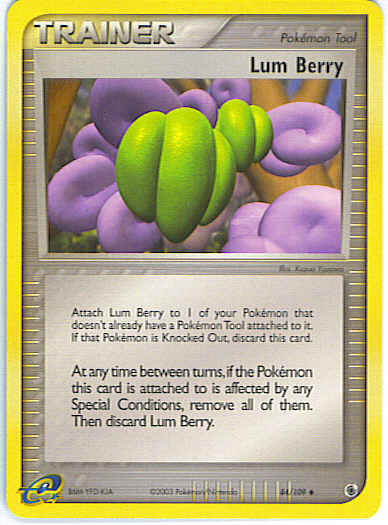 Evne2At any time between turns, if the Pokemon this card is attached to is affected by any Special Conditions, remove all of them. Then discard Lum Berry.