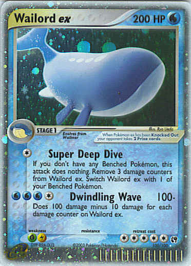 Evne[C] Super Deep Dive - If you have no Benched Pokemon, this attack does nothing. Remove 3 damage counters from Wailord ex. Switch Wailord ex with 1 of your Benched Pokemon.
