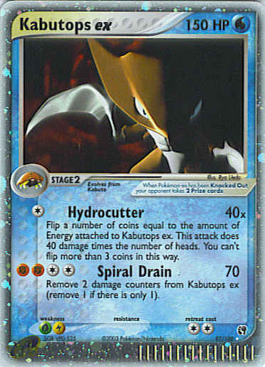 | Evne2 | [C] Hydrocutter (40x) Flip a number of coins equal to the amount of Energy attached to Kabutops ex. This attack does 40 damage times the number of heads. You can't flip more than 3 coins in this way. [CCFF] Spiral Drain (70) Remove 2 damage counters from Kabutops ex (remove 1 if there is only 1).