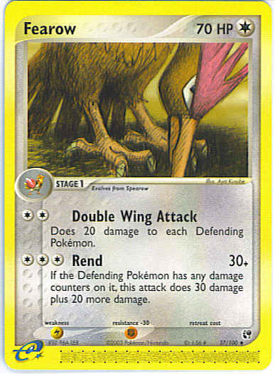 Type | Colorless | Pokemon serie | Sandstorm | Stadie | Stage 1 | HP | 70 | Sjældenhed | Uncommon | Modstand | F | Svaghed | L | Kortnummer | 37 | Evne | [CC] Double Wing Attack (20) Does 20 damage to each Defending Pokemon. [CCC] Rend (30+) If the Defending Pokemon has any damage counters on it, this attack does 30 damage plus 20 more damage.