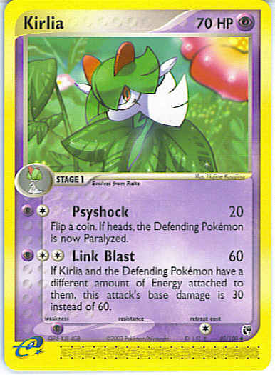 Type | Psychic | Pokemon serie | Sandstorm | Stadie | Stage 1 | HP | 70 | Sjældenhed | Uncommon | Tilbagetrækning | 1 | Svaghed | P | Kortnummer | 40 | Evne | [CP] Psyshock (20) Flip a coin. If heads, the Defending Pokemon is now Paralyzed. [CCP] Link Blast (60) If Kirlia and the Defending Pokemon have a different amount of Energy attached to them, this attack's base damage is 30 instead of 60.