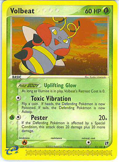 Type | Grass | Pokemon serie | Sandstorm | Stadie | Basic | HP | 60 | Sjældenhed | Uncommon | Tilbagetrækning | 1 | Svaghed | R | Kortnummer | 53 | Evne | [C] Toxic Vibration - Flip a coin. If heads, the Defending Pokemon is now Poisoned. If tails, the Defending Pokemon is now Asleep. [CG] Pester (20+) If the Defending Pokemon is affected by a Special Condition, this attack does 20 damage plus 20 more damage.
