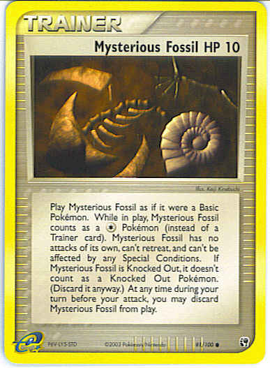 Evne Play Mysterious Fossil as if it were a Basic Pokemon. While in play, Mysterious Fossil counts as a C Pokemon (instead of a Trainer card). Mysterious Fossil has no attacks of it's own, can't retreat, and can't be affected by any Special Conditions. If Mysterious Fossil is Knocked Out, it doesn't count as a Knocked Out Pokemon. (Discard it anyway.) At any time during your turn before your attack, you may discard Mysterious Fossil from play.