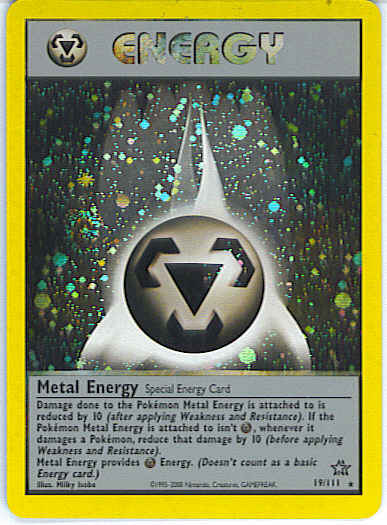 Damage done to Pokemon Metal Energy is attached to is reduced by 10 (after applying Weakness and Resistance). If the Pokemon Metal Energy is attached to isn't Steel, whenever it damages a Pokemon, reduce that damage by 10 (before applying Weakness and Resistance). Metal Energy provides M Energy. (Doesn't count as a basic Energy card.)