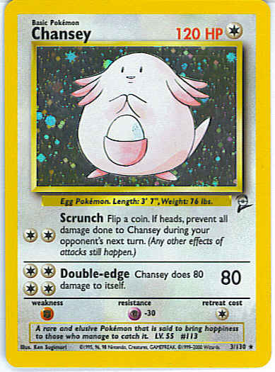 Evne [CC] Scrunch - Flip a coin. If heads, prevent all damage done to Chansey during your opponent's next turn. (Any other effects of attacks still happen.)