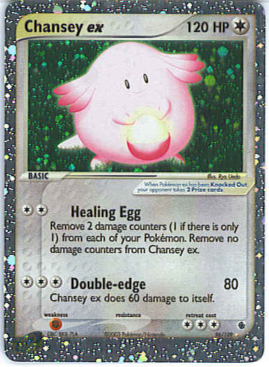 Type | Colorless | Pokemon serie | Ruby Sapphire | Stadie | Basic | HP | 120 | Sjældenhed | Ultra-Rare | Tilbagetrækning | 3 | Svaghed | F | Kortnummer | 96 | Evne | [CC] Healing Egg - Remove 2 damage counters (1 if there is only 1) from each of your Pokemon. Remove no damage counters from Chansey ex. [CCC] Double-edge (80) Chansey ex does 60 damage to itself.
