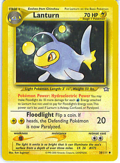 Type | Lightning | Pokemon serie | Neo Genesis | Stadie | Stage 1 | HP | 70 | Sjældenhed | Uncommon | Tilbagetrækning | 2 | Svaghed | F | Kortnummer | 38 | Evne |