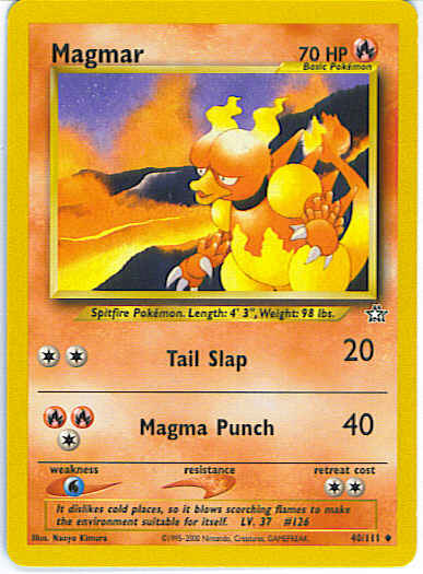 Type | Fire | Pokemon serie | Neo Genesis | Stadie | Basic | HP | 70 | Sjældenhed | Uncommon | Tilbagetrækning | 2 | Svaghed | W | Kortnummer | 40 | Evne |