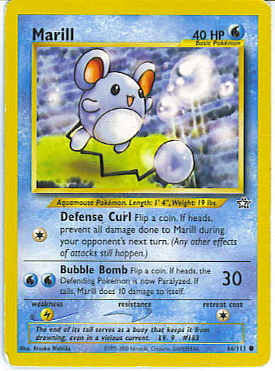 [WW] Bubble Bomb (30) Flip a coin. If heads, the Defending Pokemon is now Paralyzed. If tails, Marill does 10 damage to itself.
