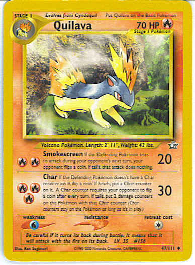 Type | Fire | Pokemon serie | Neo Genesis | Stadie | Stage 1 | HP | 70 | Sjældenhed | Uncommon | Tilbagetrækning | 1 | Svaghed | W | Kortnummer | 47 | Evne |