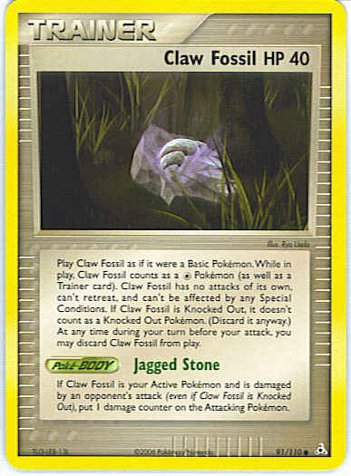 Play Claw Fossil as if it were a Basic Pokemon. While in play, Claw Fossil counts as a C Pokemon (as well as a Trainer card). Claw Fossil has no attacks of its own, can't retreat, and can't be affected by any Special Conditions. If Claw Fossil is Knocked