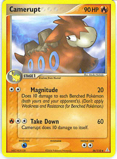Type | Fire | Pokemon serie | Holon Phantoms | Stadie | Stage 1 | HP | 90 | Sjældenhed | Uncommon | Tilbagetrækning | 2 | Svaghed | W | Kortnummer | 36 | Evne | [CC] Magnitude (20) Does 10 damage to each Benched Pokemon (both yours and your opponent's). (Don't apply Weakness and Resistance for Benched Pokemon.) [CCR] Take Down (60) Camerupt does 10 damage to itself. | Evne2 | [CC] Magnitude (20) Does 10 damage to each Benched Pokemon (both yours and your opponent's). (Don't apply Weakness and Resistance for Benched Pokemon.) [CCR] Take Down (60) Camerupt does 10 damage to itself. | Kunstner | Nakaoka |