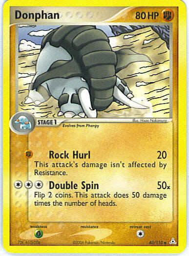 Type | Fighting | Pokemon serie | Holon Phantoms | Stadie | Stage 1 | HP | 80 | Sjældenhed | Uncommon | Tilbagetrækning | 1 | Svaghed | G | Kortnummer | 40 | Evne | [F] Rock Hurl (20) This attack's damage isn't affected by Resistance. [CCC] Double Spin (50x) Flip 2 coins. This attack does 50 damage times the number of heads. | Evne2 | [F] Rock Hurl (20) This attack's damage isn't affected by Resistance. [CCC] Double Spin (50x) Flip 2 coins. This attack does 50 damage times the number of heads. | Kunstner | Tomoaki Imakuni |