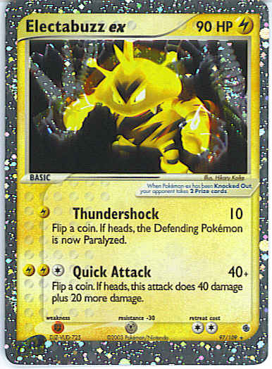 Type | Lightning | Pokemon serie | Ruby Sapphire | Stadie | Basic | HP | 90 | Sjældenhed | Ultra-Rare | Tilbagetrækning | 2 | Modstand | M | Svaghed | F | Kortnummer | 97 | Evne | [L] Thundershock (10) Flip a coin. If heads, the Defending Pokemon is now Paralyzed. [CLL] Quick Attack (40+) Flip a coin. If heads, this attack does 40 damage plus 20 more damage.