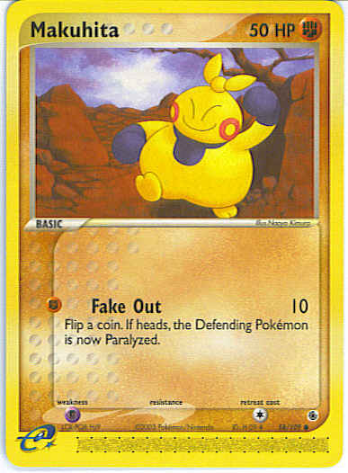 Type | Fighting | Pokemon serie | Ruby Sapphire | Stadie | Basic | HP | 50 | Sjældenhed | Common | Tilbagetrækning | 1 | Svaghed | P | Kortnummer | 58 | Evne | [F] Fake Out (10) Flip a coin. If heads, the Defending Pokemon is now Paralyzed.