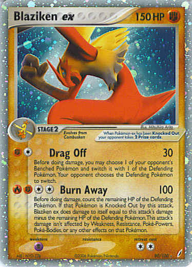 [CCFR] Burn Away (100) Before doing damage, count the remaining HP of the Defending Pokemon. If that Pokemon is Knocked Out by this attack, Blaziken ex does damage to itself equal to this attack's damage minus the remaining HP of the Defending Pokemon. This attack's damage isn't affected by Weakness, Resistance, Poke-Powers, Poke-Bodies, or any other effects on that Pokemon.
